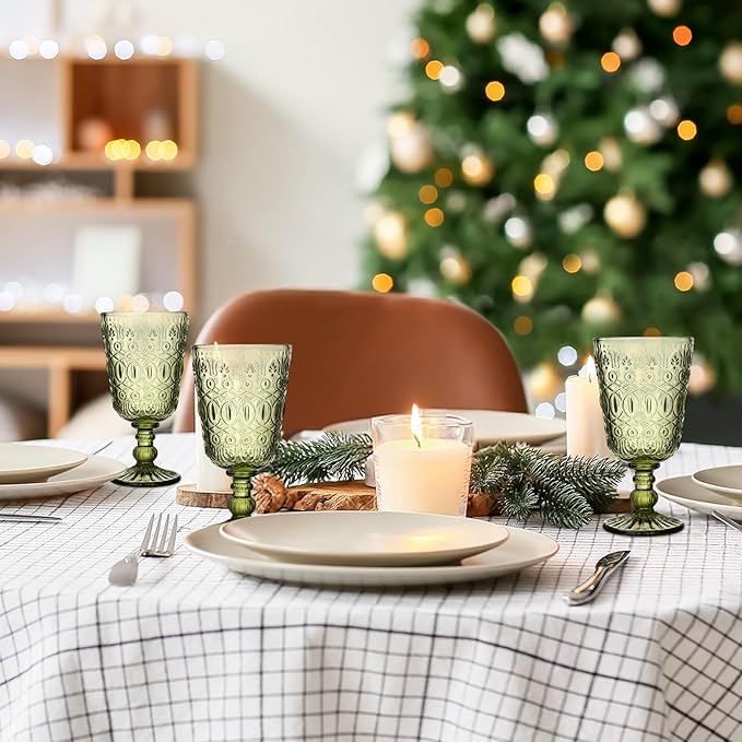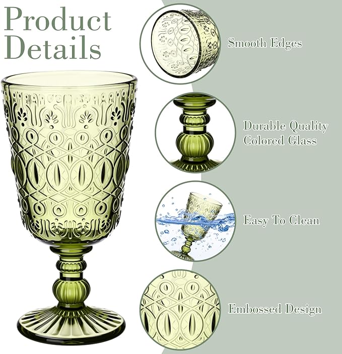 Eaasty Wine Glasses Set of 6 Vintage Goblet 9 oz Vintage Colored Glass Goblet Beverage Stemmed Glass Cups Romantic Embossed Glassware for Wedding Party Holidays Anniversary (Green)