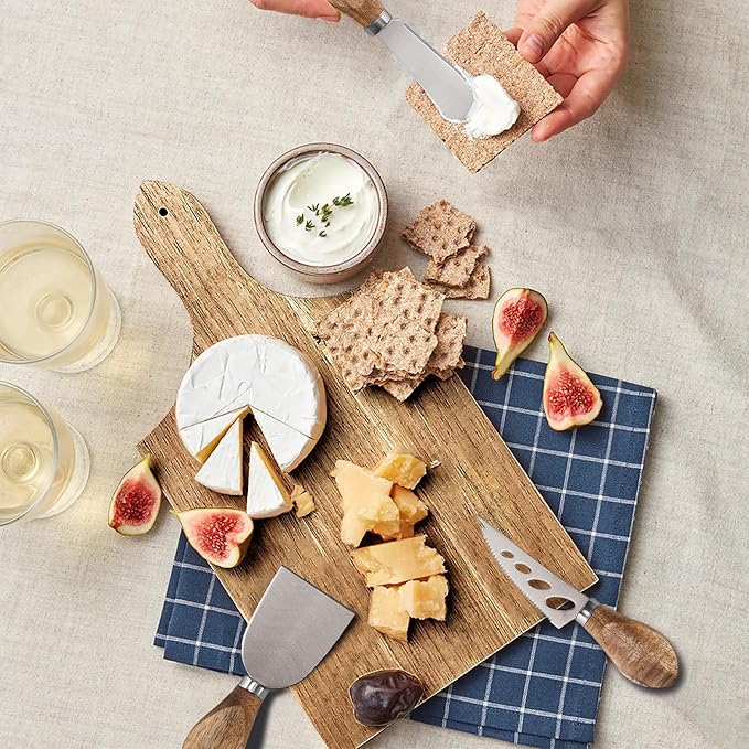 • Designed to provide the right weight and balance, the natural wooden handle are often more comfortable for efficient and effortless cutting. Acacia wood always can add a rustic, elegant, or artisanal look to your cheese knives, enhancing the presentation of your cheese board.