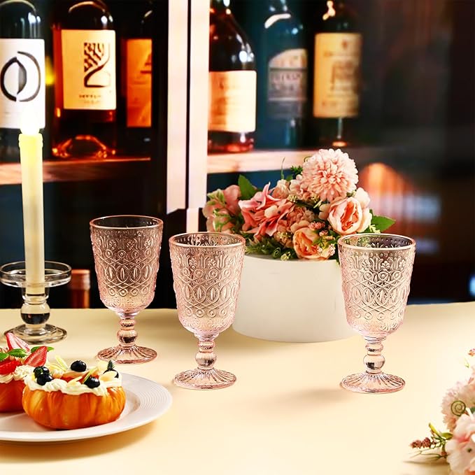 Eaasty Wine Glasses Set of 6 Vintage Goblet 9 oz Vintage Colored Glass Goblet Beverage Stemmed Glass Cups Romantic Embossed Glassware for Wedding Party Holidays Anniversary (Pink)