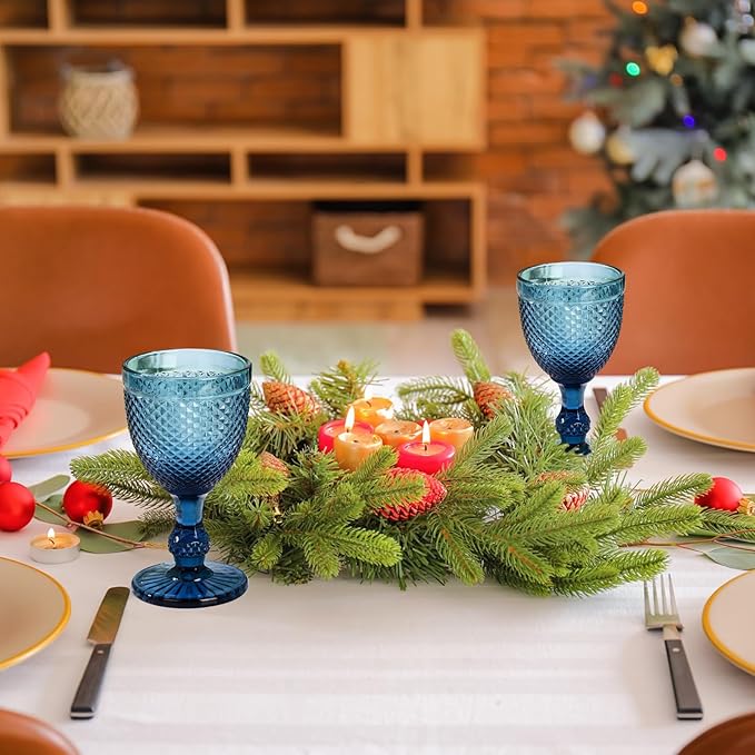 Bokon 6 Pack Blue Glass Goblets Set 10 oz High Clear Wine Glass Vintage Water Goblets Cups Embossed Diamond Design Glassware with Stem for Drinking Juice Liquor Party Wedding Bar