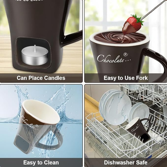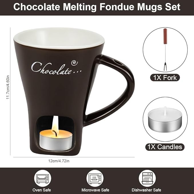• 【Easy To Use】The bottom design of the chocolate fondue mug accommodates small candles to ensure even heating, allowing you to easily melt ingredients like chocolate, cheese, and more.Whether you're enjoying a sweet treat by yourself or preparing a romantic dessert for two, this fondue cups tealight allows you to create delicious masterpieces with ease.