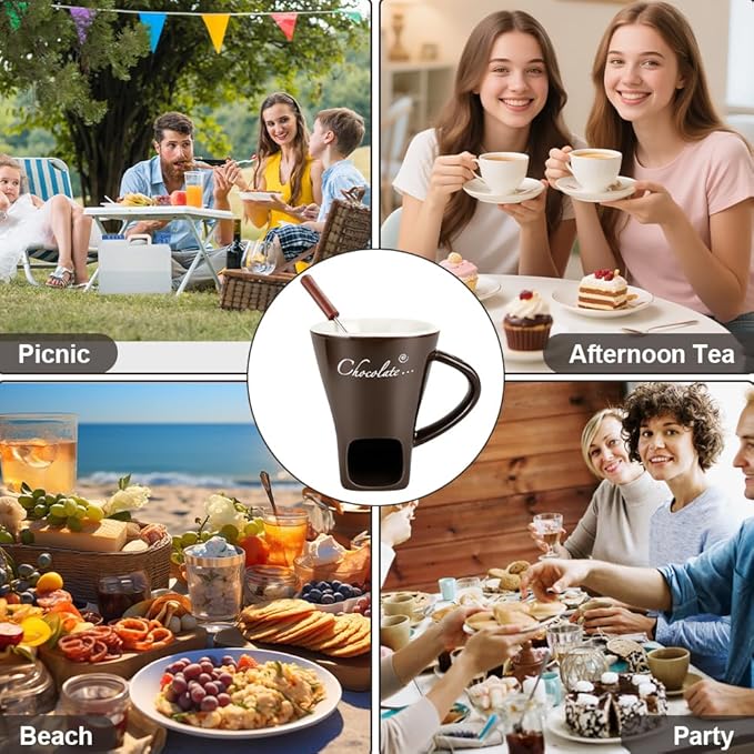 • 【Multi-functional Chocolate Melting Mug】 Our chocolate fondue cup is not just for chocolate, this chocolate fondue mug can be used with a variety of dips, such as caramel or cheese, it can as a regular mug, suitable for a cozy gatherings.