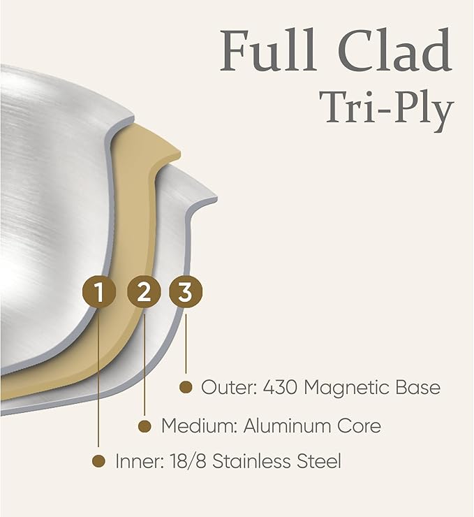 • 5. Premium Food-Grade Safety: PFAS/PFOA/PFOS-Free 18/8 stainless steel, non-toxic material certified for daily cooking. Full tri-ply clad construction prevents warping and hot spots.