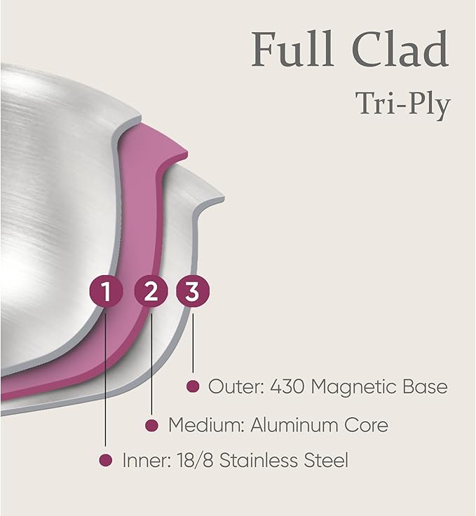 • 5. Premium Food-Grade Safety: PFAS/PFOA/PFOS-Free 18/8 stainless steel, non-toxic material certified for daily cooking. Full tri-ply clad construction prevents warping and hot spots.