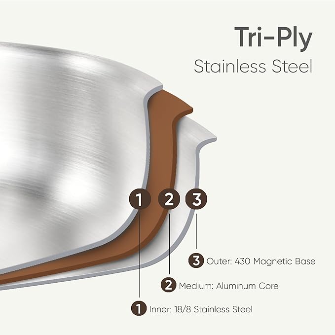 • 5. Premium Food-Grade Safety: PFAS/PFOA/PFOS-Free 18/8 stainless steel, non-toxic material certified for daily cooking. Full tri-ply clad construction prevents warping and hot spots.