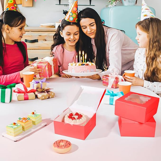 36 pcs 6x6x3 Inches Small Cake Box with Window, Bakery Pastry Cookie Boxes, Mini Pie for Pastry,Dessert,Strawberries,Chocolates, Cupcakes with paper stickers (Red)
