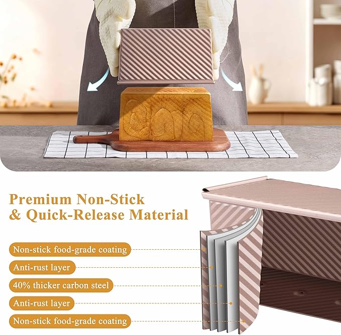 • Non-stick & Quick Release: the pullman loaf pan features a premium non-stick food-grade coating which is free of harmful substances, allows your bread releases effortlessly, designed for perfect results every time, helping your loaves pop out intact with a beautifully golden and appealing crust
