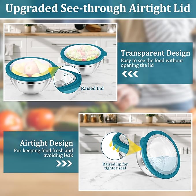 - 【Upgrade Visible Airtight Lid】 Each metal mixing bowl comes with a visible lid, Allows you to easily see the contents without opening it, The lid silicone side is completely wrapped around the bowl and not warp easily, Mixing bowls with lids are great for keep food fresh and avoid spilling and leaking, Raised lid design to provide more capacity for food storage and will not squeeze foods, And the protruding handle makes the lid easier to open