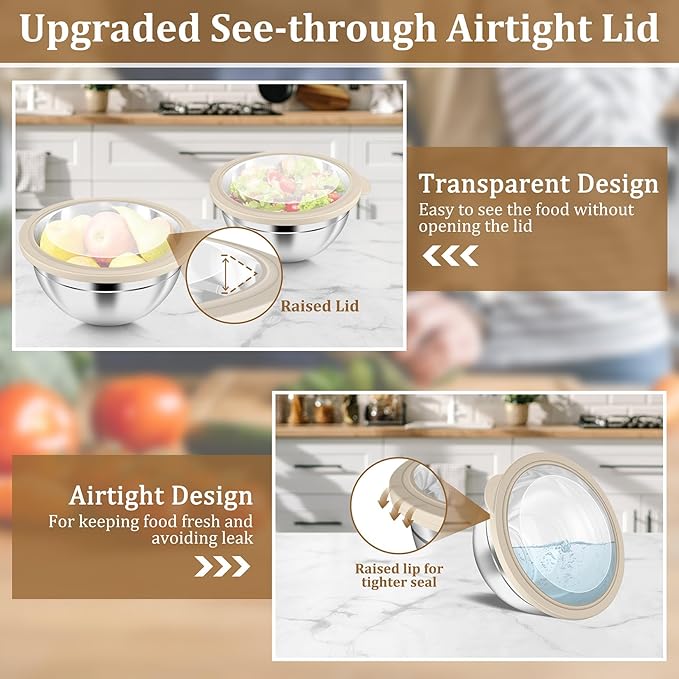 - 【Upgrade Visible Airtight Lid】 Each metal mixing bowl comes with a visible lid, Allows you to easily see the contents without opening it, The lid silicone side is completely wrapped around the bowl and not warp easily, Mixing bowls with lids are great for keep food fresh and avoid spilling and leaking, Raised lid design to provide more capacity for food storage and will not squeeze foods, And the protruding handle makes the lid easier to open