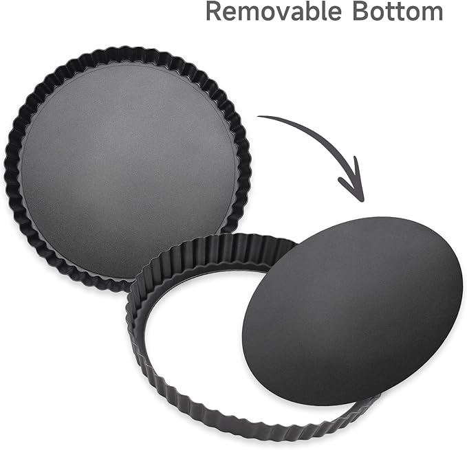 - Removable Bottom Design Say goodbye to broken crusts! The tart pan with removable bottom allows for easy lifting and flawless transfer of your baked creations without damaging the shape or structure. The removable bottom makes it easier to cut/serve. Also, the tart pan allows for a much more attractive presentation than traditional pans without a removable bottom. The pie pans for baking 9 inch combined with the nonstick surface, cleanup becomes fast and hassle-free.