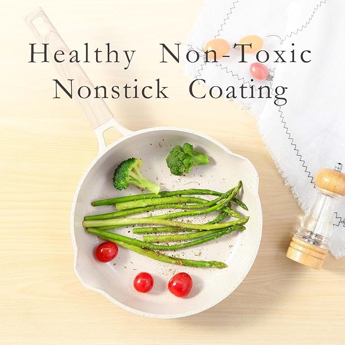 • Eco-friendly Non-Stick Ceramic Coating & Super Easy to Clean - Our cookware set interior is coated by non-stick ceramic coating, SGS approved, 100% PFOA free. Require less oil or butter for cooking and minimal scrubbing for a spotless clean, giving you a healthier and more enjoyable at-home cooking experience.