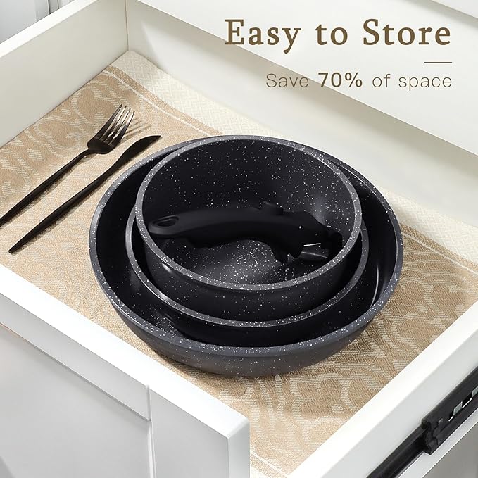 • 70% Space-Saving Design - Unique detachable handles allow compact storage, perfect for small kitchens, RVs, or dorm rooms. Save up to 70% more space compared to traditional cookware