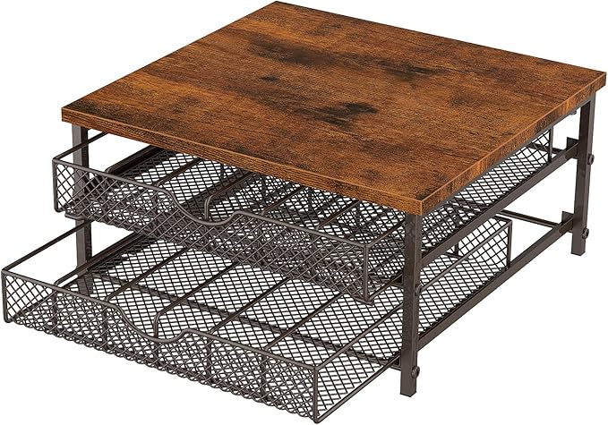 • Quality Materials: The pod storage drawer for k cups is made from a combination of solid metal and quality wood, sturdy and practical. The metal mesh basket keeps the aeration drying. The top wood board can place your coffee machine, is waterproof and easy to clean. It has excellent convenience and keeps your home clean and tidy.