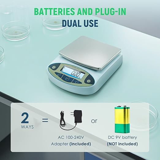 • Batteries and Plug-in Dual Use - The precision scale can be operated using either a DC 9V battery (not included) or an AC 100–240V adapter (included). Note: Batteries are intended for emergency use only and provide approximately 30 minutes of operation.