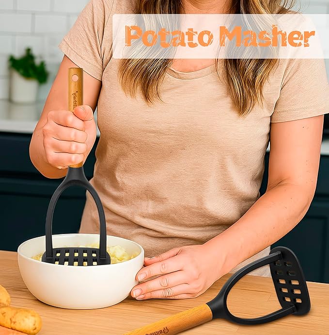- 👨🍳【10pcs Silicone Kitchen Utensils Set 】Our silicone cooking utensils set is a economic set for cooking and baking. This kitchen utensils set with wood handle contains total 10pcs different kitchen tools such as 1x Solid spoon, 1x Ladle, 1x Slotted Turner, 1x Solid Turner,1x Pasta Spoon, 1x Cooking Spoon,1x Skimmer, 1x Slotted Spoon, 1x Potato Masher, 1x Whisk. All of them can meet your needs for cooking.