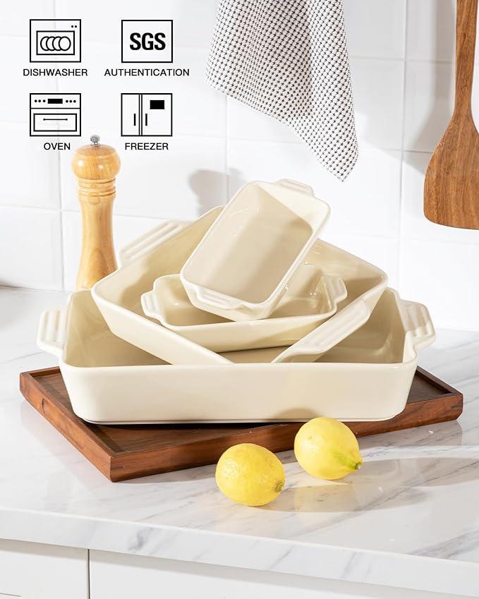 Sweejar Ceramic Bakeware Set of 4, Casserole Dishes for Oven, Rectangular Baking Dish with Handles, Lasagna Pans Deep for Cooking, Gratin, Roasting, Banquet and Daily Use (Beige)