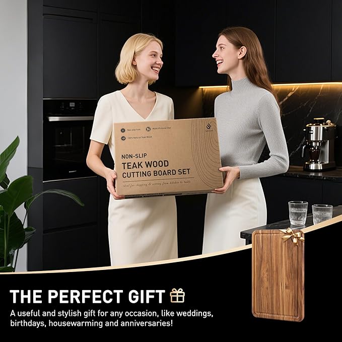 - Exceptional Non-Slip Design and Superior Craftsmanship:Our FSC-certificated teak wood cutting board set comes with a non-slip base, ensuring stability on any countertop. The FSC-certificated teak wood is carefully crafted with rounded edges for a comfortable grip, and its construction maintains shape and flatness over time. Ideal for all your kitchen cutting needs, these teak cutting boards for kitchen are a blend of functionality and elegance.