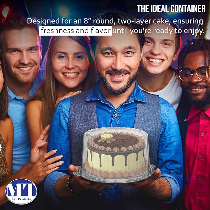 • THE PERFECT CONTAINER: From delicious pies to mouth-watering pastries this plastic cake container is the perfect item for any café, bakery, or grocery. These clear cake containers are perfectly designed for a 8” round 2 layer cake, it will keep things fresh and tasty until ready to eat.