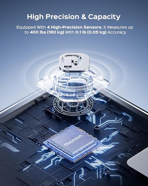 • Accurate & High Capacity: 4 precision sensors deliver 0.05kg/0.1lb accuracy. This weight scale supports up to 400lb/180kg with unit conversion