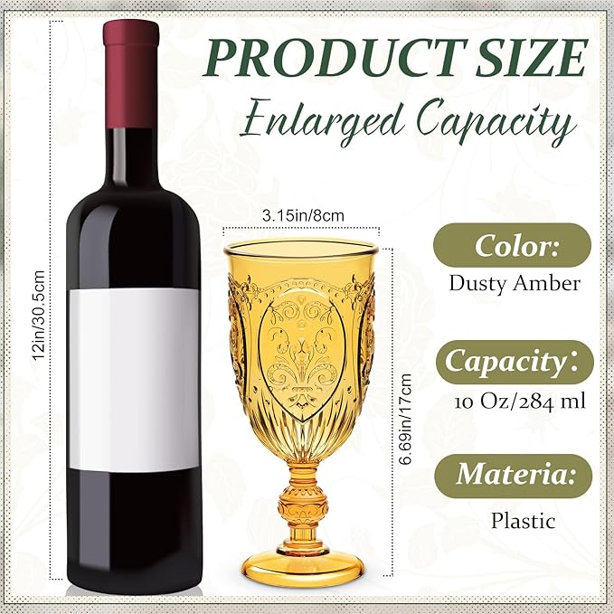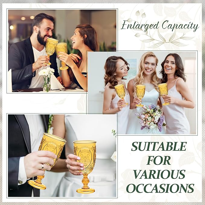 • Plastic Amber Goblet Set: you will receive a set of 60 plastic amber goblets, each with a capacity of 10 ounces; The bright and charming amber color adds a touch to various occasions; Whether as party decorations or the ideal gift for weddings or other special events, this goblet set will add a touch of elegance and joy to your celebrations