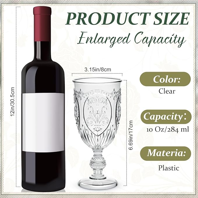 • Suitable Size: this plastic goblet is designed with a perfect size, with a diameter of 2.8 inch, a height of 6 inch, and a capacity of 10 oz; Its perfect size and capacity make it an ideal choice for a variety of drinks, whether it is champagne, wine, cocktails, juice, or drinks, it can add a touch of romance and sophistication to every drinking experience