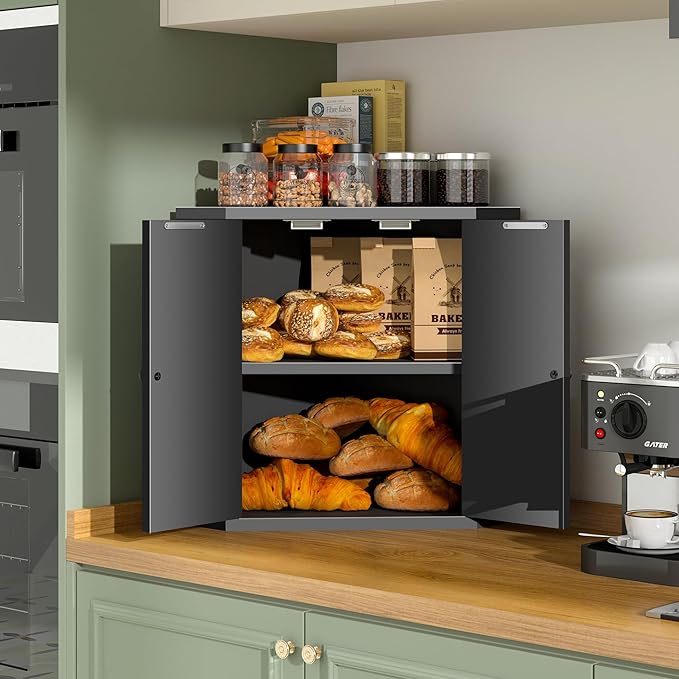 • Large Capacity For Your Family: While other bread boxes for kitchen counter can only hold 1 loaf of bread. Our 2-layer countertop breadbox can hold a giant pile of bread, rolls, bagels, tortillas, muffins and more. Effectively avoid the deformation of bread due to extrusion. It’s ideal for a large family and helps to declutter your countertops