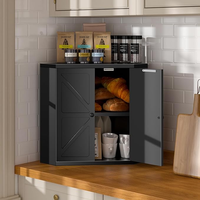 Corner Bread Box for Kitchen Countertop,Storage Container for Homemade Bread, Double Layer BreadBox, Large Capacity Bread Storage Bin, Vintage Farmhouse Breadbox Organizer,Black