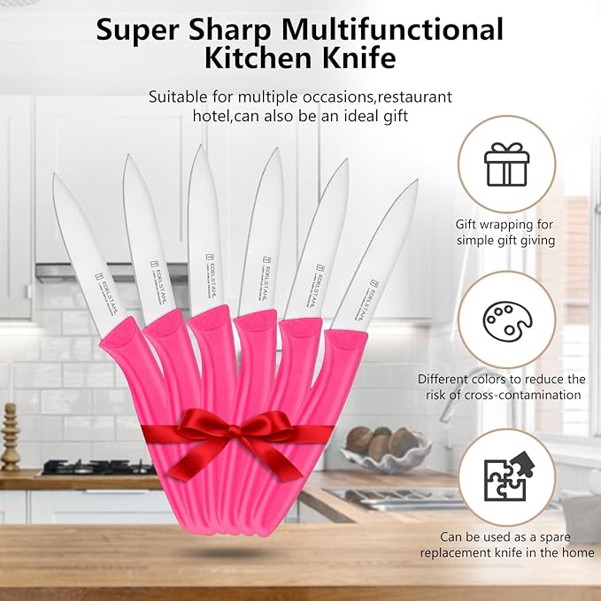 • 【Size】Paring knives set,fruit knives 6 pieces set,each knife is 19CM long and weighs 27.5g/pc.Blade size:8.5CM|3.35 inch.vegetable knife set of 6 in pink color,they match each other and cut accurately,perfect to meet the basic needs of the family.