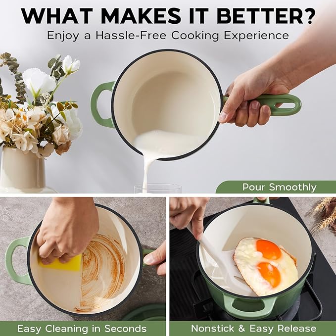 • Enameled Cast Iron: sauce pan is made of cast iron core with triple enameled coating inside and outside, resists rust, chipping, or fading, no harmful substances releasing, healthy and durable