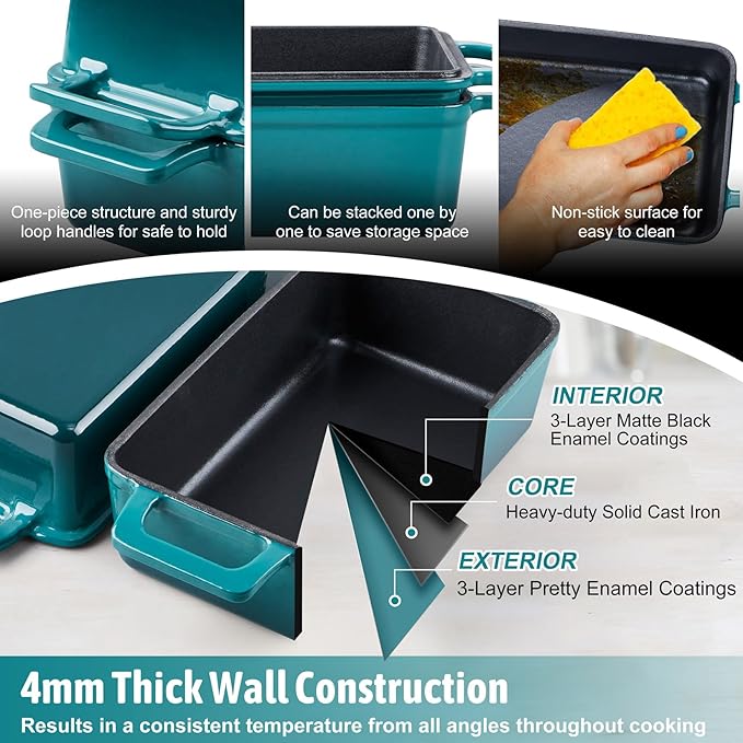 - 【Multi-functional Use】These enamel loaf pans are good for baking bread, pound cake, toast and meatloaf, Can be used as a container for brownies and sandwiches, Also can cook, roast and stew different meat and vegetable, Cast iron meatloaf pans work with oven, gas stove, induction cooker, ceramic stove , grill and so on, Good to prepare delicious bread and food for family gathering or friends party, Beautiful color and appearance will decor your kitchen