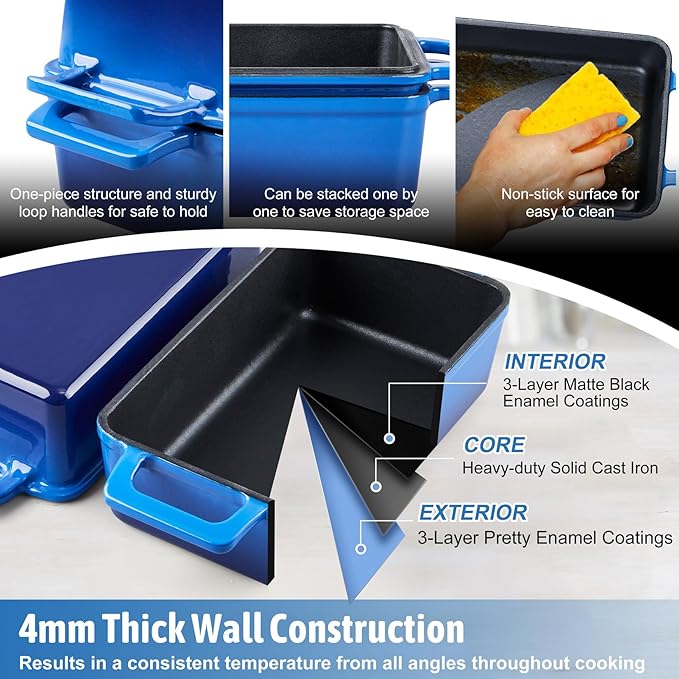 - 【Heavy-Duty & Healthy】P&P CHEF bread pan set is made of heavy-duty cast iron core with matte black enamel interior and blue glossy enamel exterior, 3.8mm thicken loaf pan side makes it sturdy and solid for long time use, Food-grade material can withstand high temperature without harmful substance releasing, No toxic material reacting with your food in daily use, will protect the health of you and your families, Good replacement of other aluminum and silicone bread baking pans