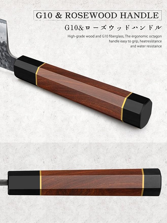 • 【Ergonomic Rosewood Handle】The traditional Japanese octagonal handles of this kitchen knife set perfectly fit any hand, significantly reducing fatigue and making it suitable for extended use. Imported rosewood is paired with two exquisite copper wires for an exceptional visual experience and cutting performance