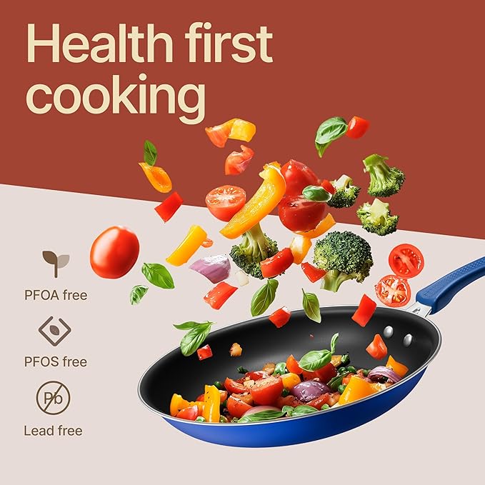 • NONSTICK COOKWARE SET – Crafted with PFOS and PFOA-free materials with non stick coating that’s safer for health and 10x more nonstick, ensuring easy food release and cleanup. Though dishwasher safe, handwashing is recommended to maintain its premium quality.