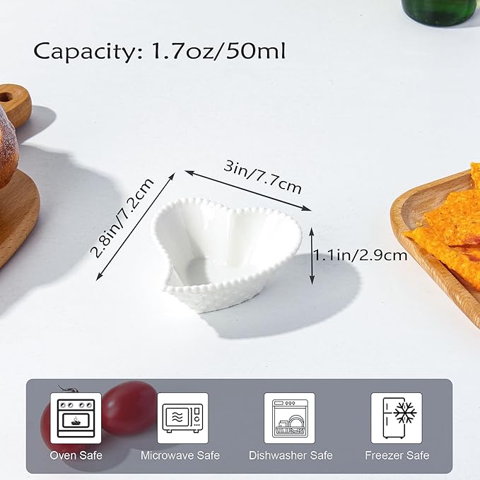 • Compact Size: with approximate size of 3 x 2.8 x 1.1 inches, these heart shaped dishes' compact size makes them practical for serving mini snacks and dips; Stand out with this distinctive heart shape design that represents love and warmth.