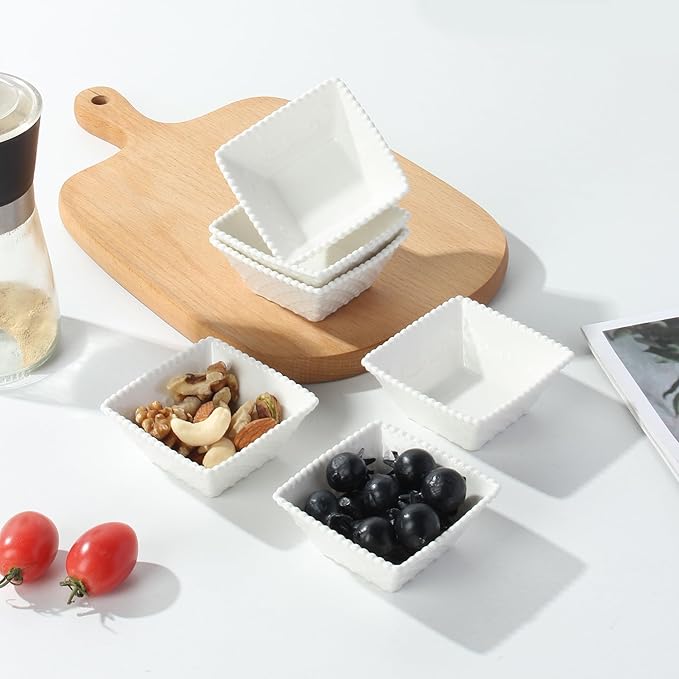 UIBFCWN 6 Pack Ceramic Dip Bowls Set, 2.3oz White Dipping Sauce Bowls/Dishes for Tomato Sauce, Square Side Dishes, Mini Appetizer Plates for Condiment