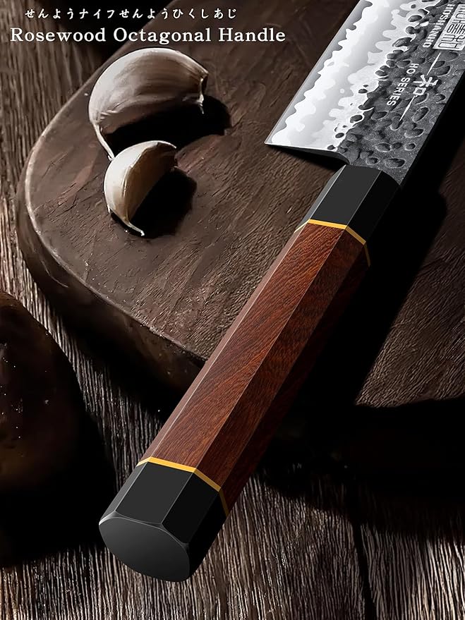 • 【Japanese Traditional Octagonal Handle】Ergonomically octagonal handle can provide a firm and safe grip and improve accuracy, ensuring reduced fatigue during extended kitchen sessions; High-quality rosewood combined with two copper wires embodies the details, which is both fashionable and noble
