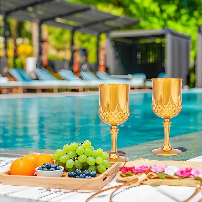 JLYLOL Plastic Vintage Wine Glasses 7OZ Plastic Goblets Vintage Drinking Glasses 24PCS Retro Wedding Glassware Water Goblets Reusable Drinking Cups for Party,Reception,Celebration,Bar,Whiskey(Amber)