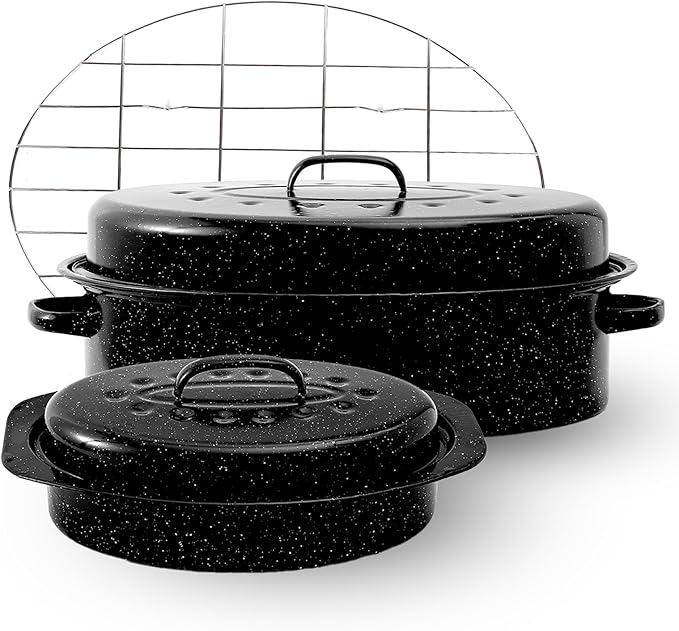 • Dual Size Options for Every Need:Choose between a 13-inch or 19-inch enamel roasting pan to suit your cooking requirements. The 19-inch roaster pan with lid and rack features a spacious 17-inch inside diameter, easily accommodating up to a 20-pound turkey or large roasts.