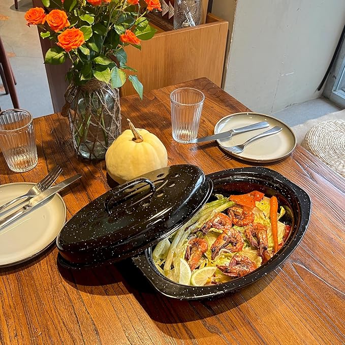 • Superior Moisture and Flavor Retention:The included lid traps steam and flavors, ensuring juicy and succulent results. Say goodbye to dry roasts and hello to mouthwatering meals that your family and guests will love.
