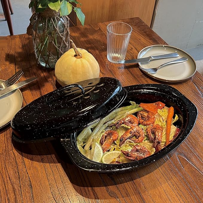 • Great Holiday Gift:With its elegant appearance and practical functions, this granite enamel roaster pan set makes a perfect holiday gift. Whether it's for a wedding, housewarming, or Christmas, it's a thoughtful present for cooking enthusiasts. If you have any questions, our customer service team is always ready to assist you!