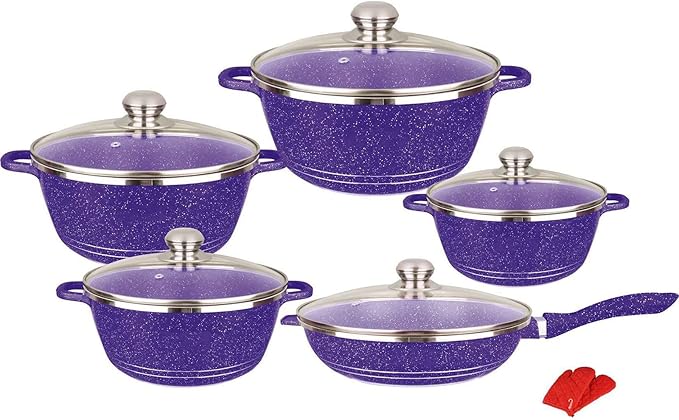 10-Piece Nonstick Granite Cookware Set - Marble Coated Aluminum Pots & Pans with Glass Lids, Includes Saucepans, Frying Pan, Stock Pot - Deeppurple Kitchen Essentials