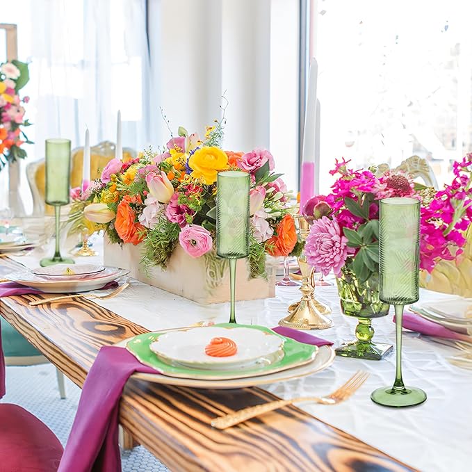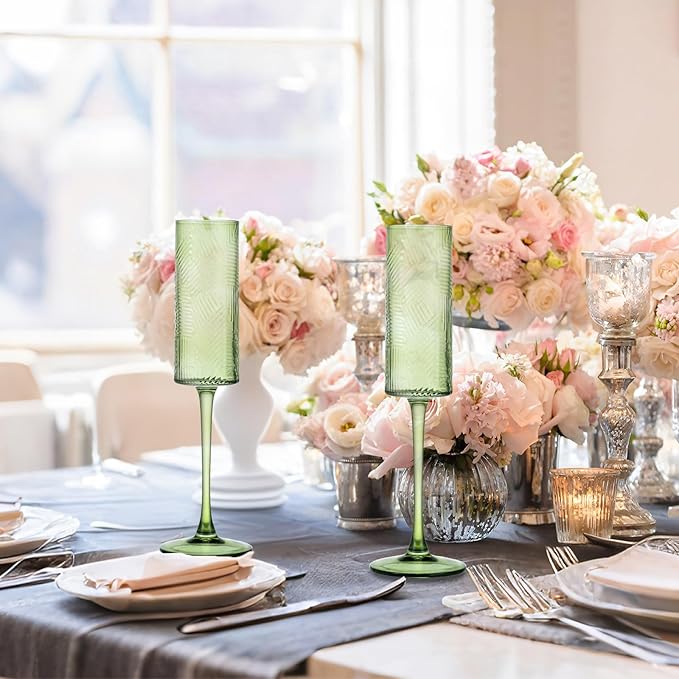 6 Pieces Green Champagne Flutes,6 OZ Twill Pattern Striped Vintage Stem Glasses Stemware Wine Glasses Champagne Long Stem Drinking Colored Glasses Goblets for Wedding Cocktail Cups,Cava, Prosecco