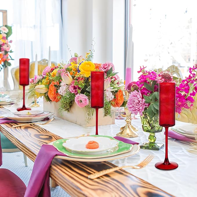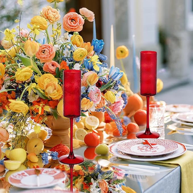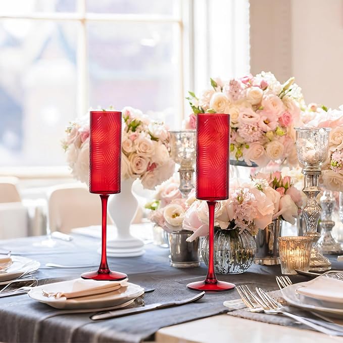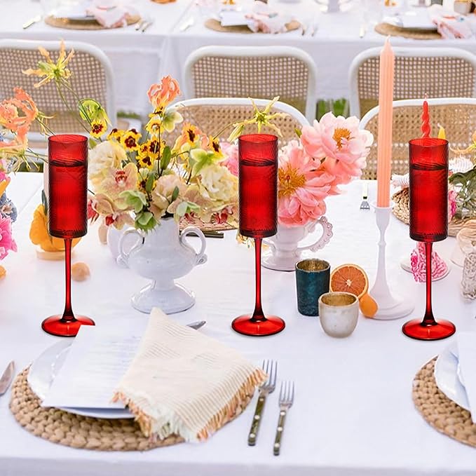 6 Pieces Red Champagne Flutes,6 OZ Twill Pattern Striped Vintage Stem Glasses Stemware Wine Glasses Champagne Long Stem Drinking Colored Glasses Goblets for Wedding Cocktail Cups,Cava, Prosecco