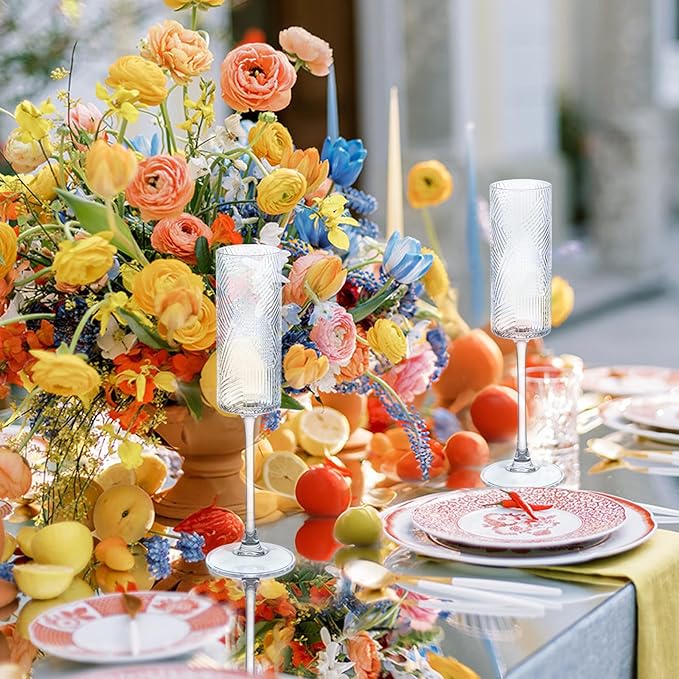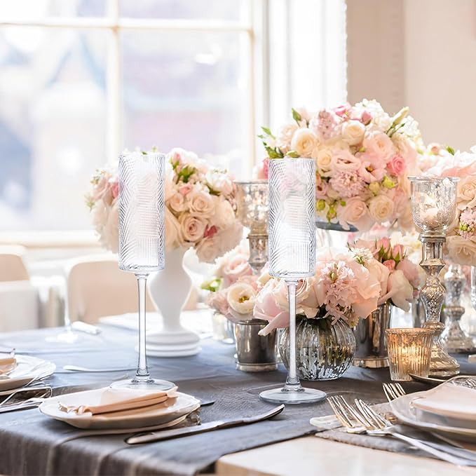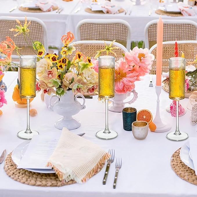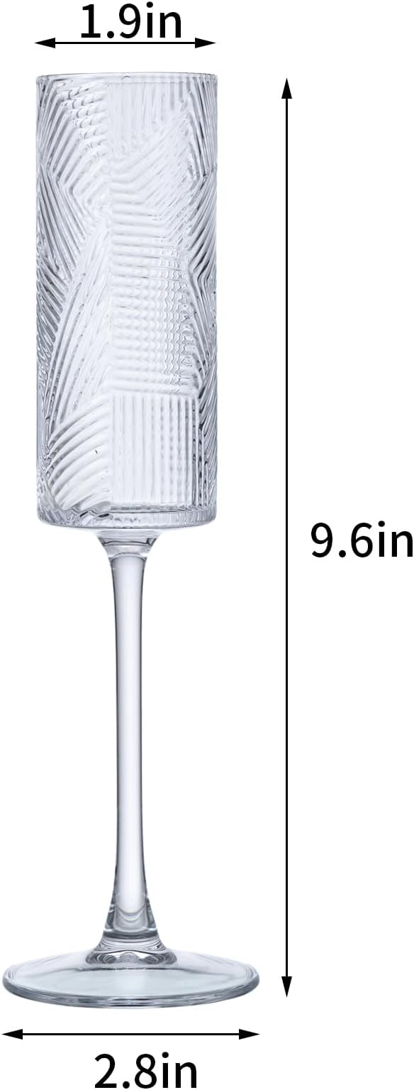 6 Pieces Clear Champagne Flutes,6 OZ Twill Pattern Striped Vintage Stem Glasses Stemware Wine Glasses Champagne Long Stem Drinking Colored Glasses Goblets for Wedding Cocktail Cups,Cava, Prosecco