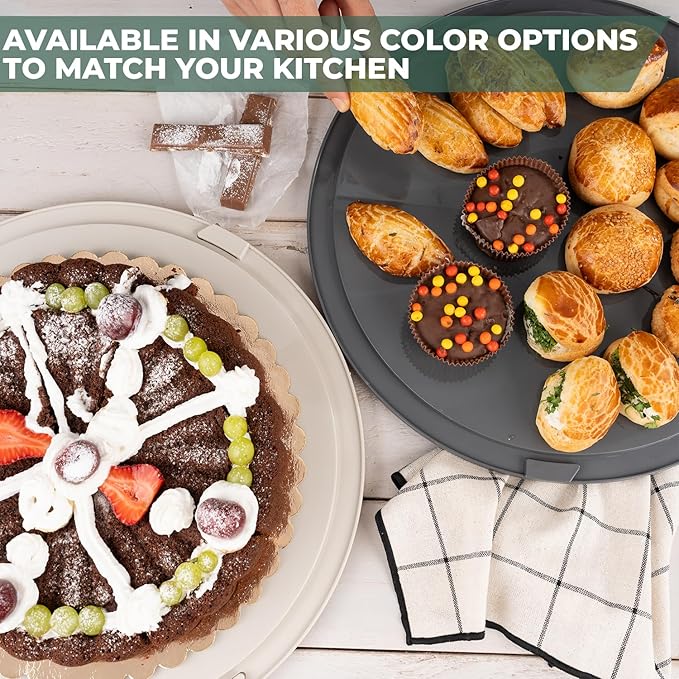 • SPACIOUS and STYLISH ROUND DESIGN: With its generous 13-inch size, this cake carrier is perfect for holding large cakes, cheesecakes, pies, and other baked goods. Its elegant round shape adds a modern touch to your kitchen decor, serving as both a functional item and a decorative piece.