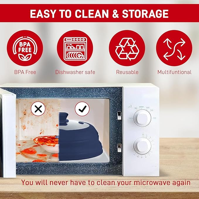 • 👍 VERSATILE MICROWAVE PLATE COVER: This plate guard is collapsible to fit inside a microwave oven. Cover a plate or bowl of food while heating it to avoid splatters. Or, unfold the dome to cover a pot or pan.