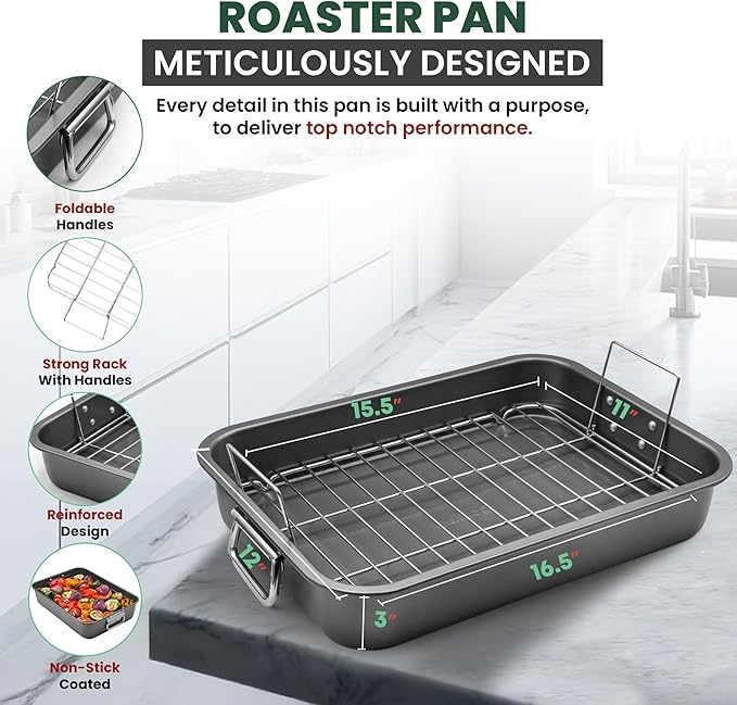 • DURABLE BUILD: Our turkey roaster pan is built durable thick and solid with reinforced edges and the roasting pan rack is made with super strong wire