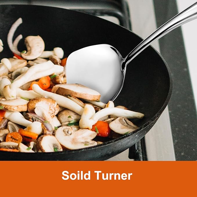• Ergonomic Design: The 304 stainless steel spatula set can easily handle large woks of 13-14 inches and above, keeping your hands away from the heat source and steam on the edge of the wok. The metal kitchen utensils set effectively isolates heat transfer, making the cooking process safe and comfortable.