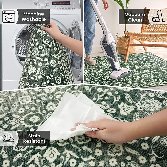 Vintage 2x7 Runner Rug, Forest Green Washable Runners for hallways, Super Soft Kitchen Runner Rug Non Slip, Print Faux Wool Floral Thin Carpet Runner for Entryway Indoor Bedside Runner