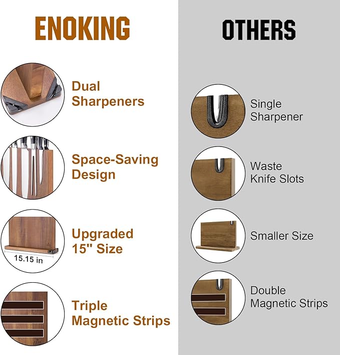 ENOKING 15.2" Extra Large Magnetic Knife Block with Dual Sharpeners, Acacia Wood Knife Holder & Display Stand with Strong Magnets